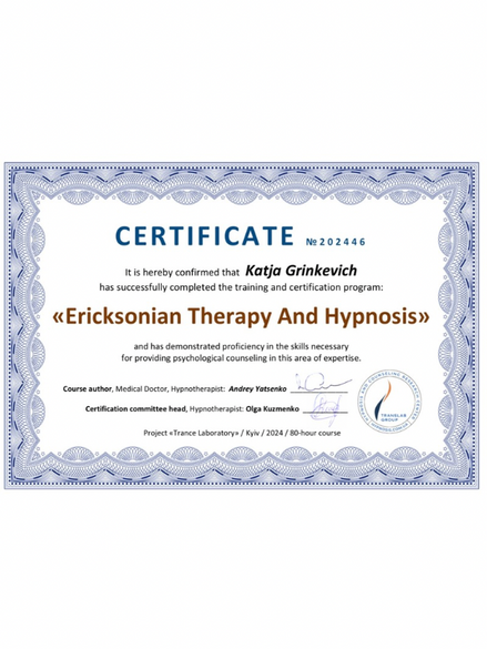 Berufliche Weiterbildung: Ich bin zertifizierter psychologischer und systemischer Coach, NLP-Praktikerin und psychosomatische Beraterin. Meine Ausbildung in Psychosomatik habe ich an einer der führenden Schulen Russlands absolviert, die die Grundlage für meine professionelle Tätigkeit bildet.